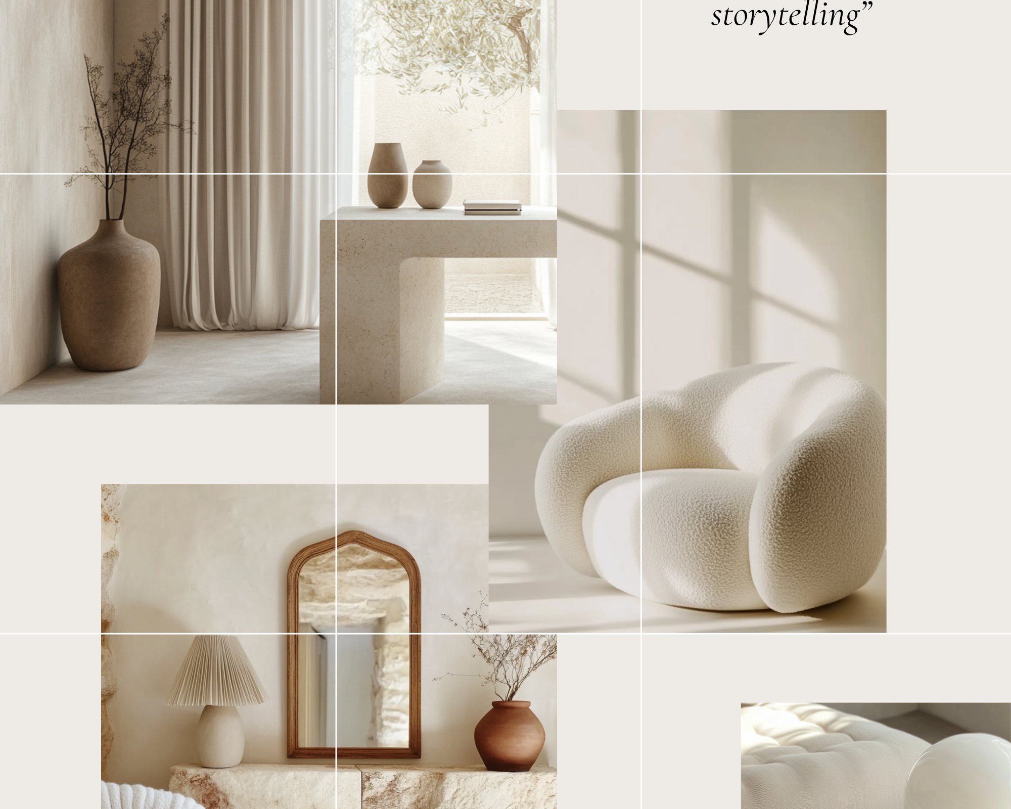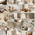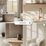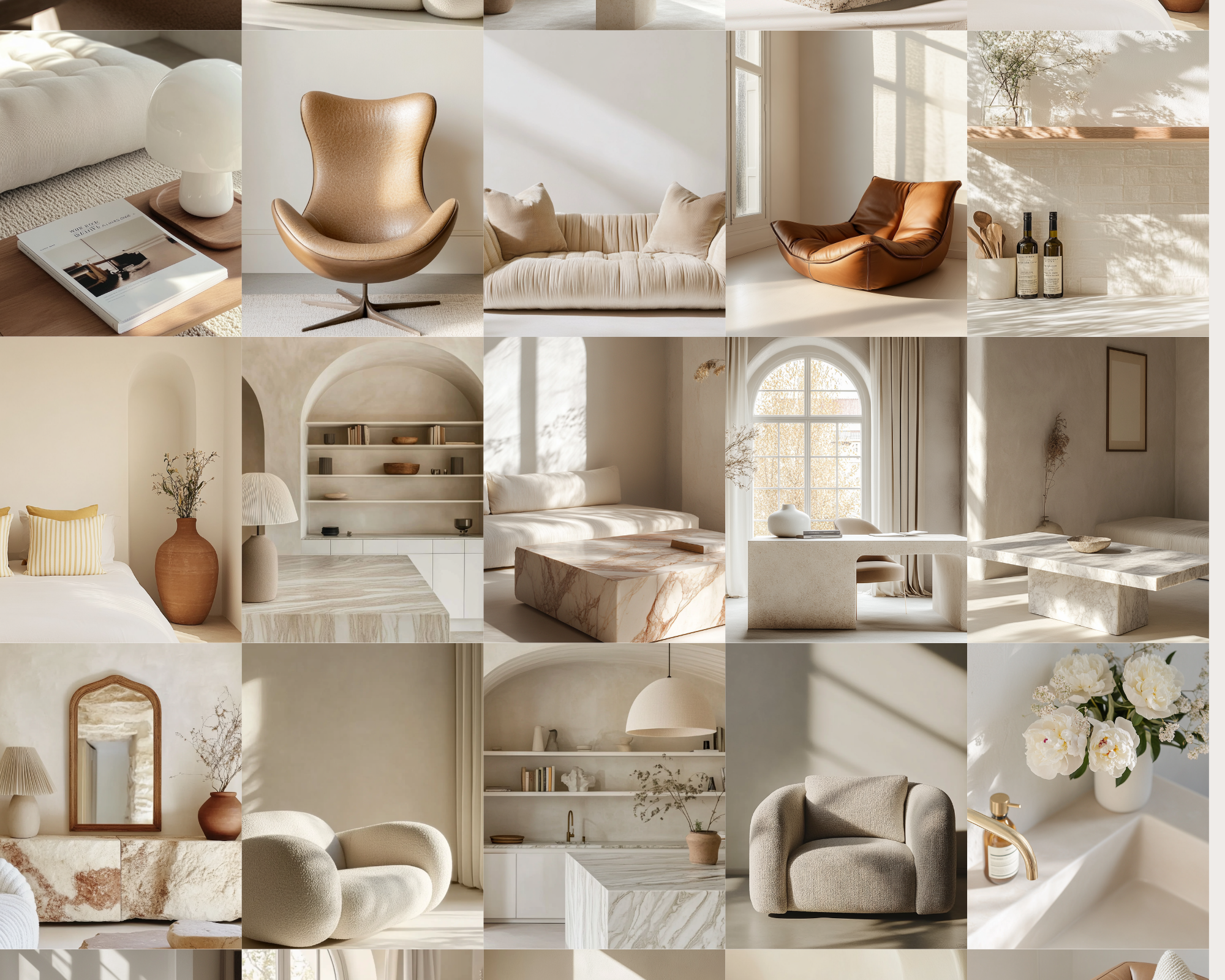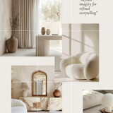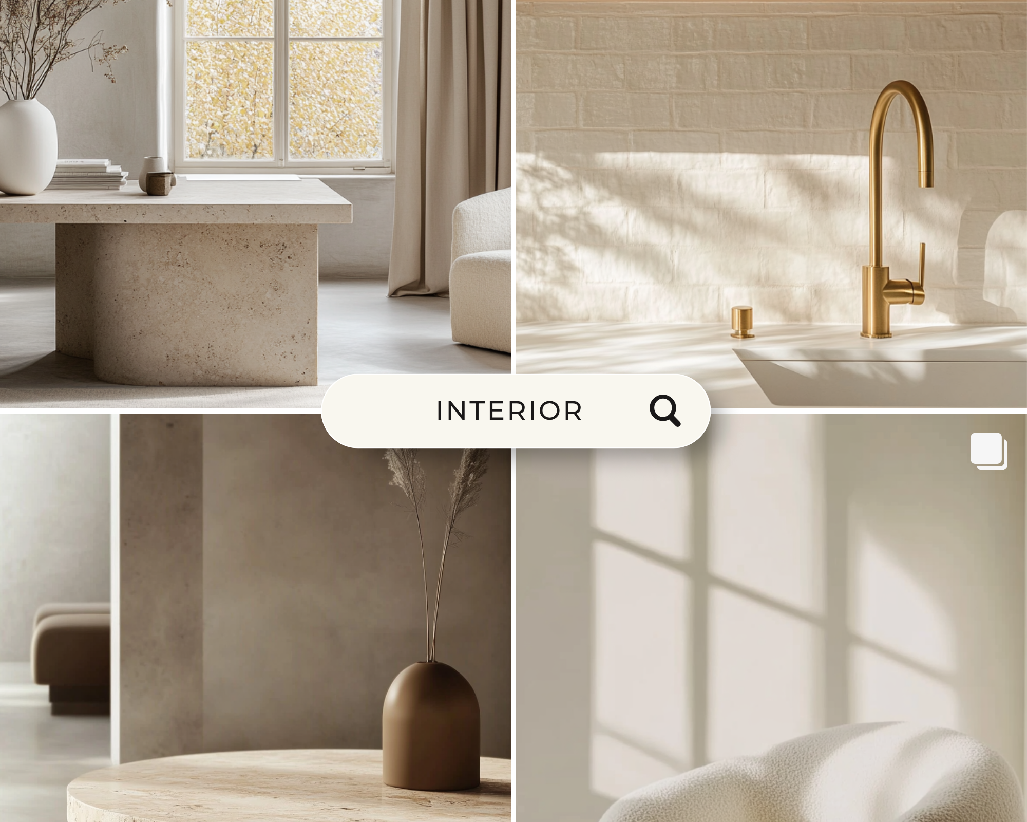 The Interior collection features architectural light, sculptural forms, and a curated palette of warm neutrals, stone textures, and natural materials—capturing elevated spaces that feel serene, grounded, and effortlessly luxurious.