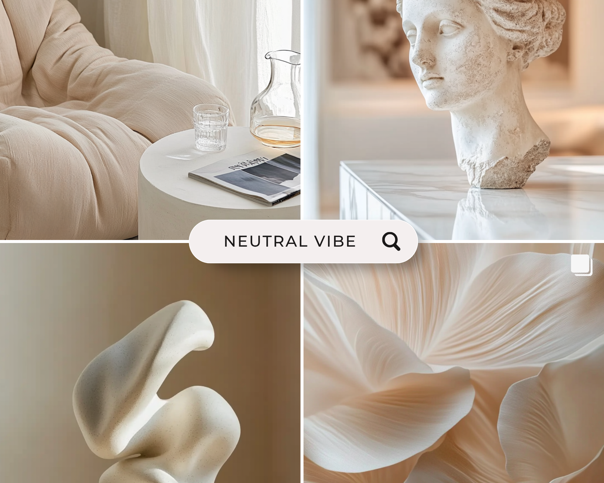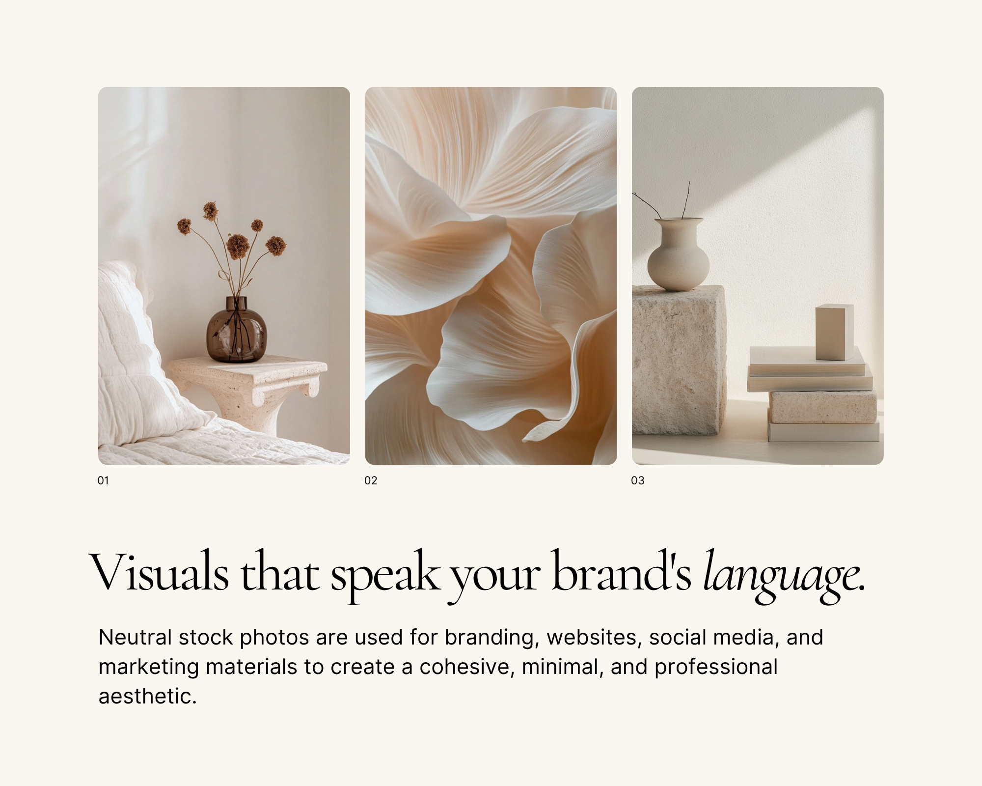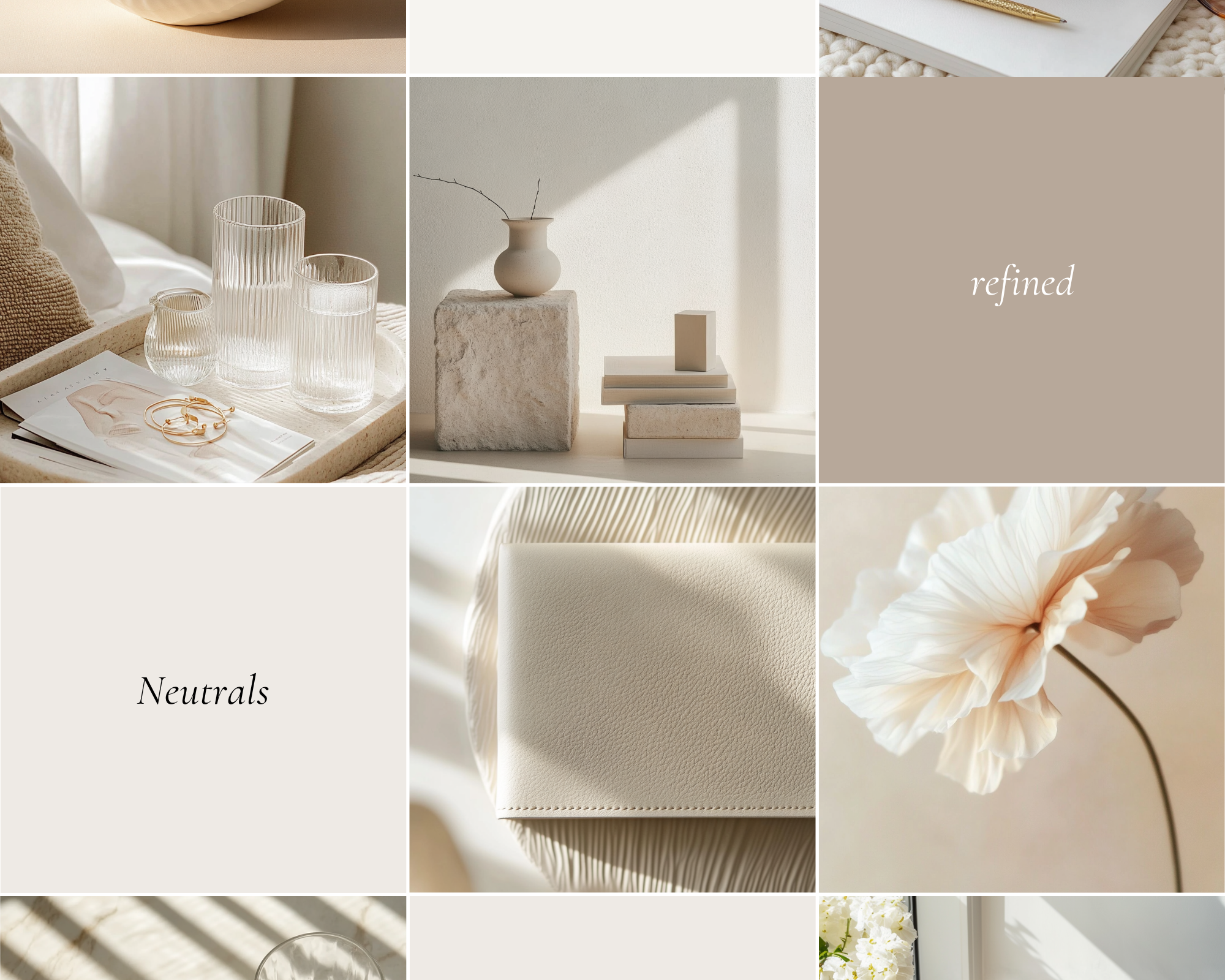 Each photo in the Neutral collection features soft natural light, curated textures, and a refined color palette of creamy beiges, warm whites and organic tones, creating a calm, sophisticated aesthetic that enhances storytelling and adds a touch of luxury to any visual platform.