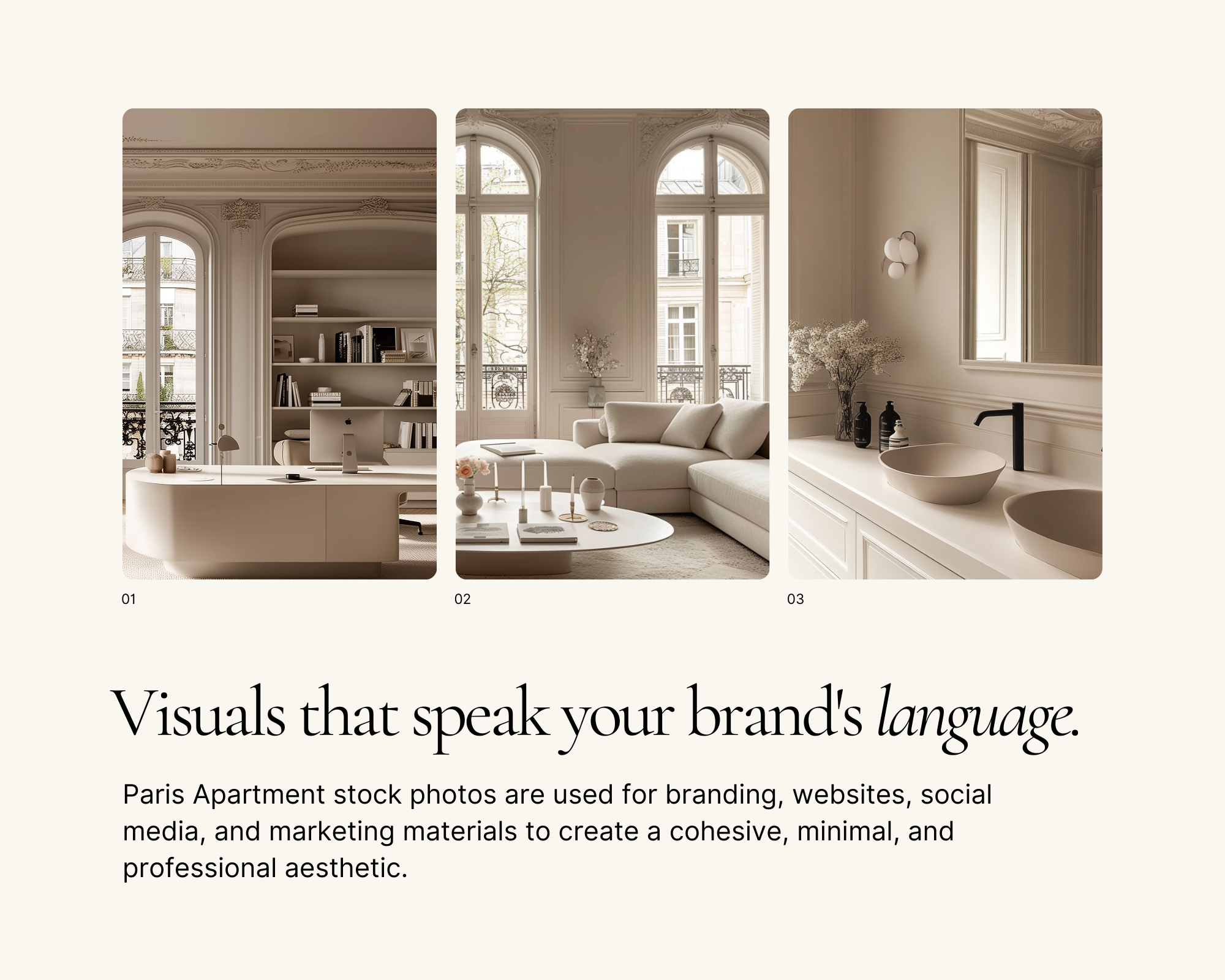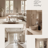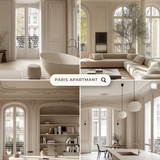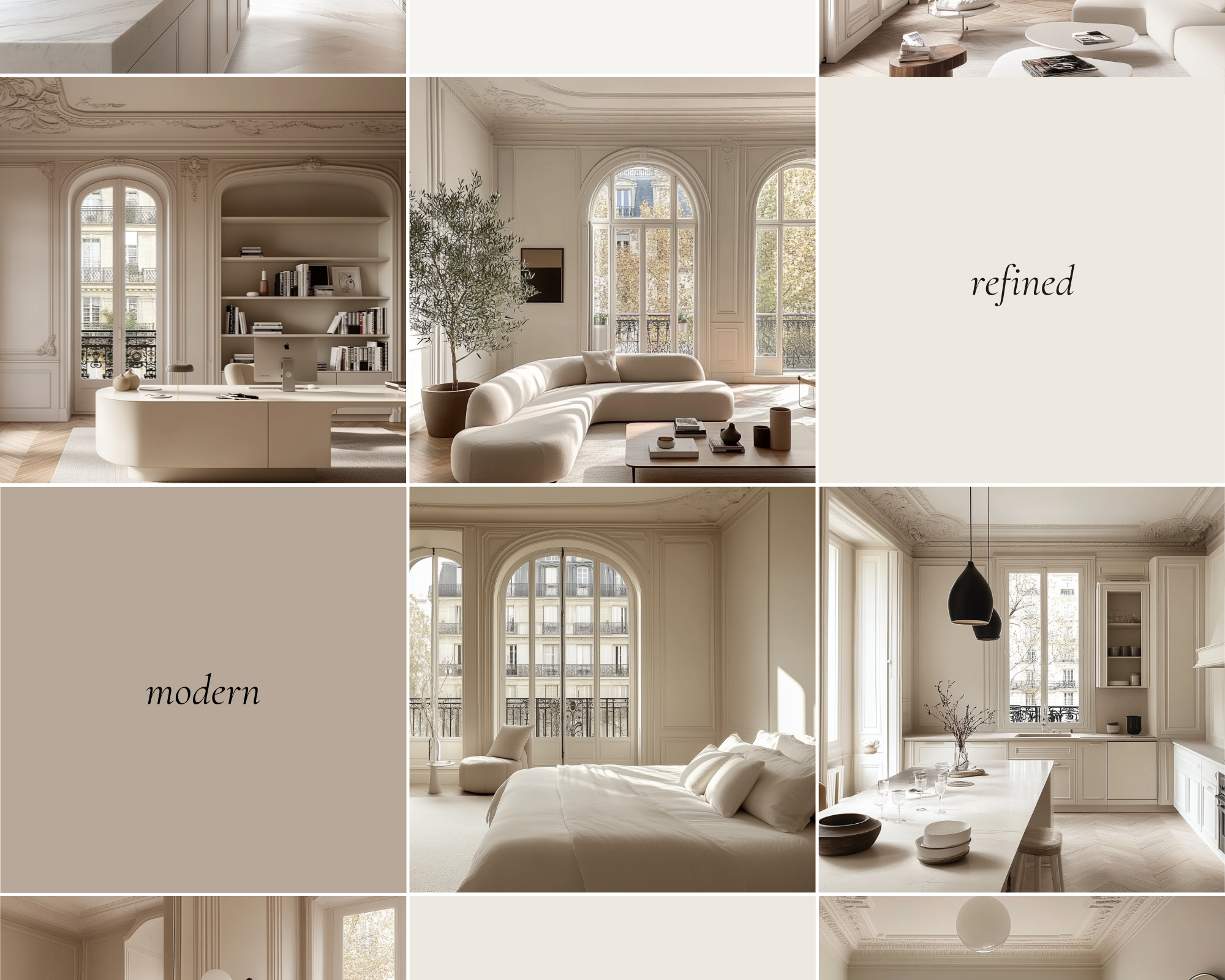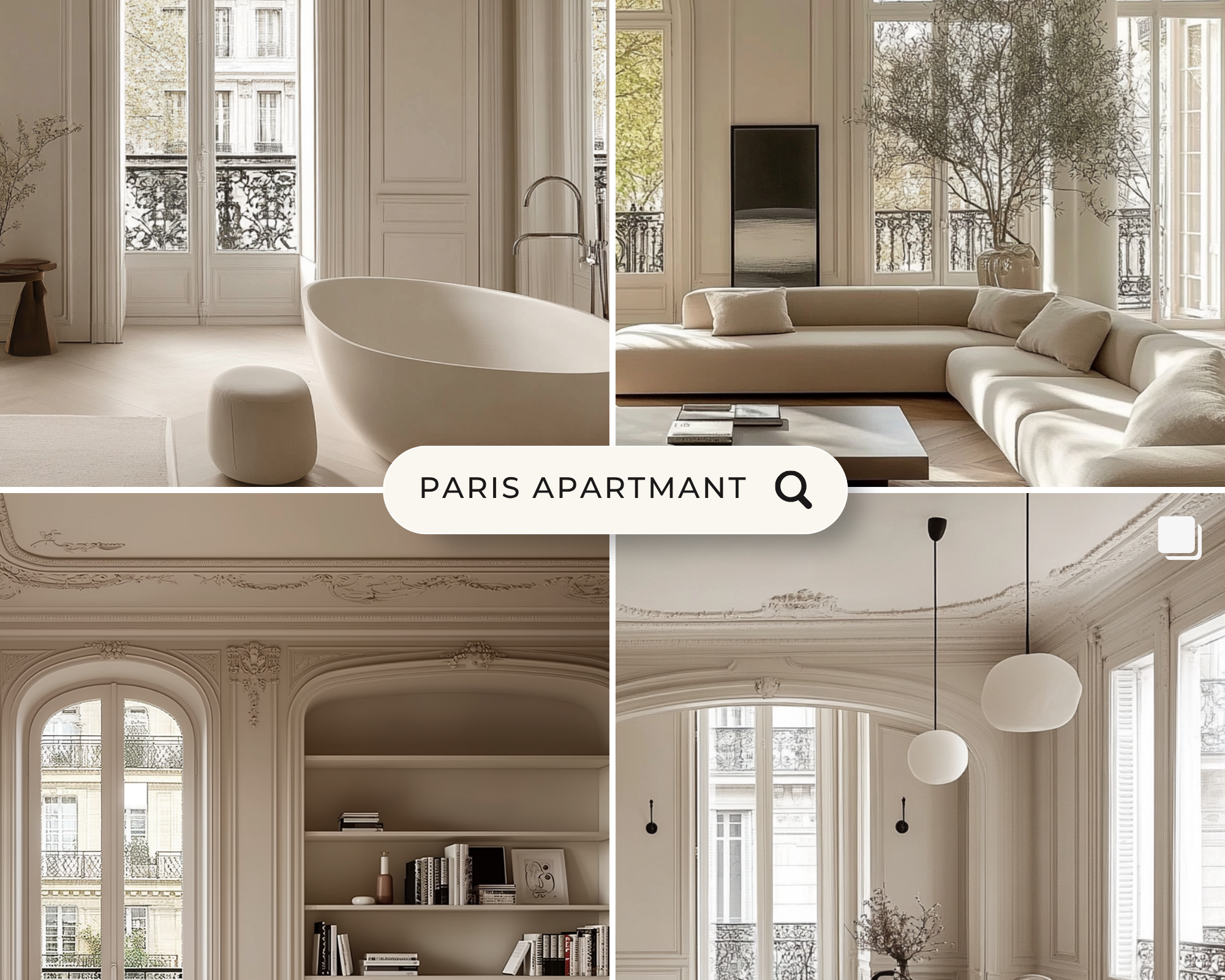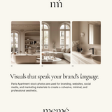 The Paris Apartment collection captures spacious Haussmann-style interiors, soft neutral palettes, ornate moldings, and natural light flooding through tall windows. Each image balances old-world charm and modern design—making your brand feel effortlessly elevated and serene.