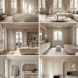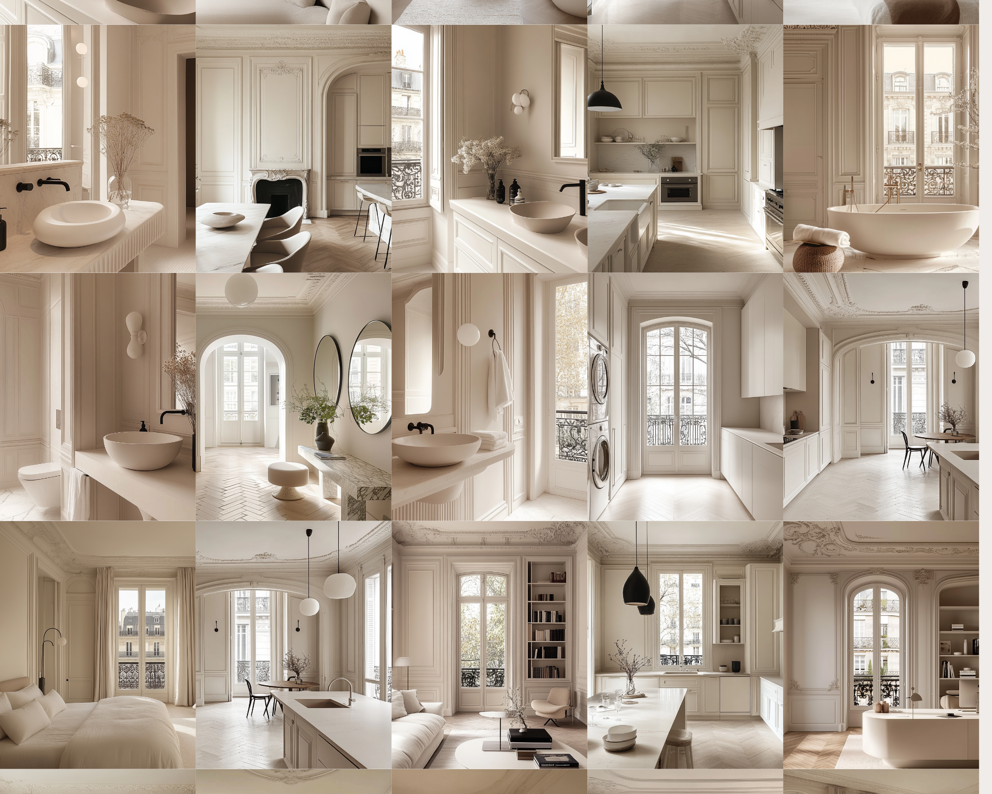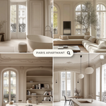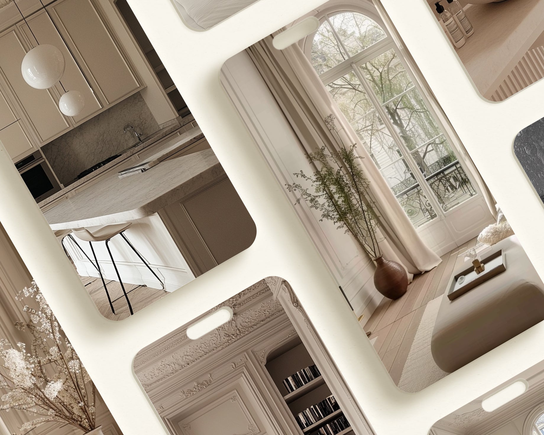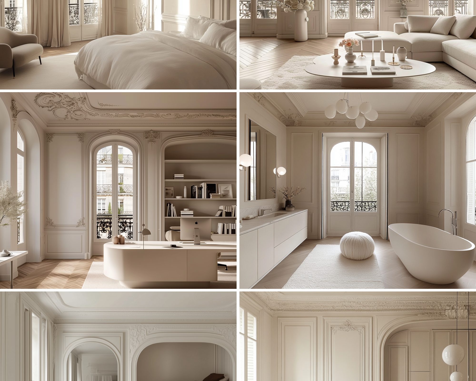 The Paris Apartment collection captures spacious Haussmann-style interiors, soft neutral palettes, ornate moldings, and natural light flooding through tall windows. Each image balances old-world charm and modern design—making your brand feel effortlessly elevated and serene.